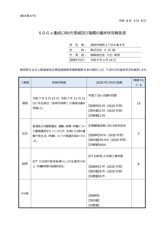 当社は2022年2月14日に新潟県SDGs推進建設企業登録制度に登録し、SDGsの達成に向け取り組みを行っております。